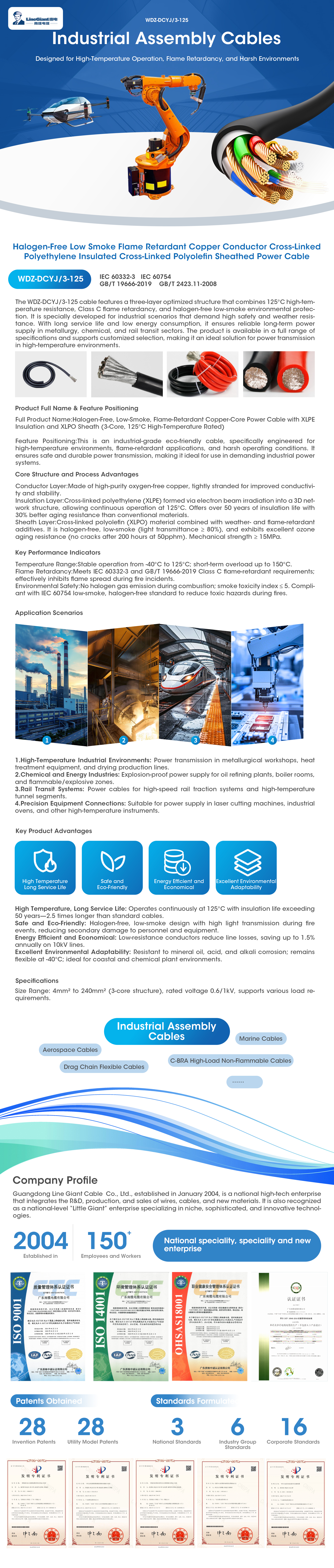 WDZ-DCYJ/3-125 Halogen-Free Low Smoke Flame Retardant Copper Conductor Cross-Linked Polyethylene Insulated Cross-Linked Polyolefin Sheathed Power Cable OEM/ODM